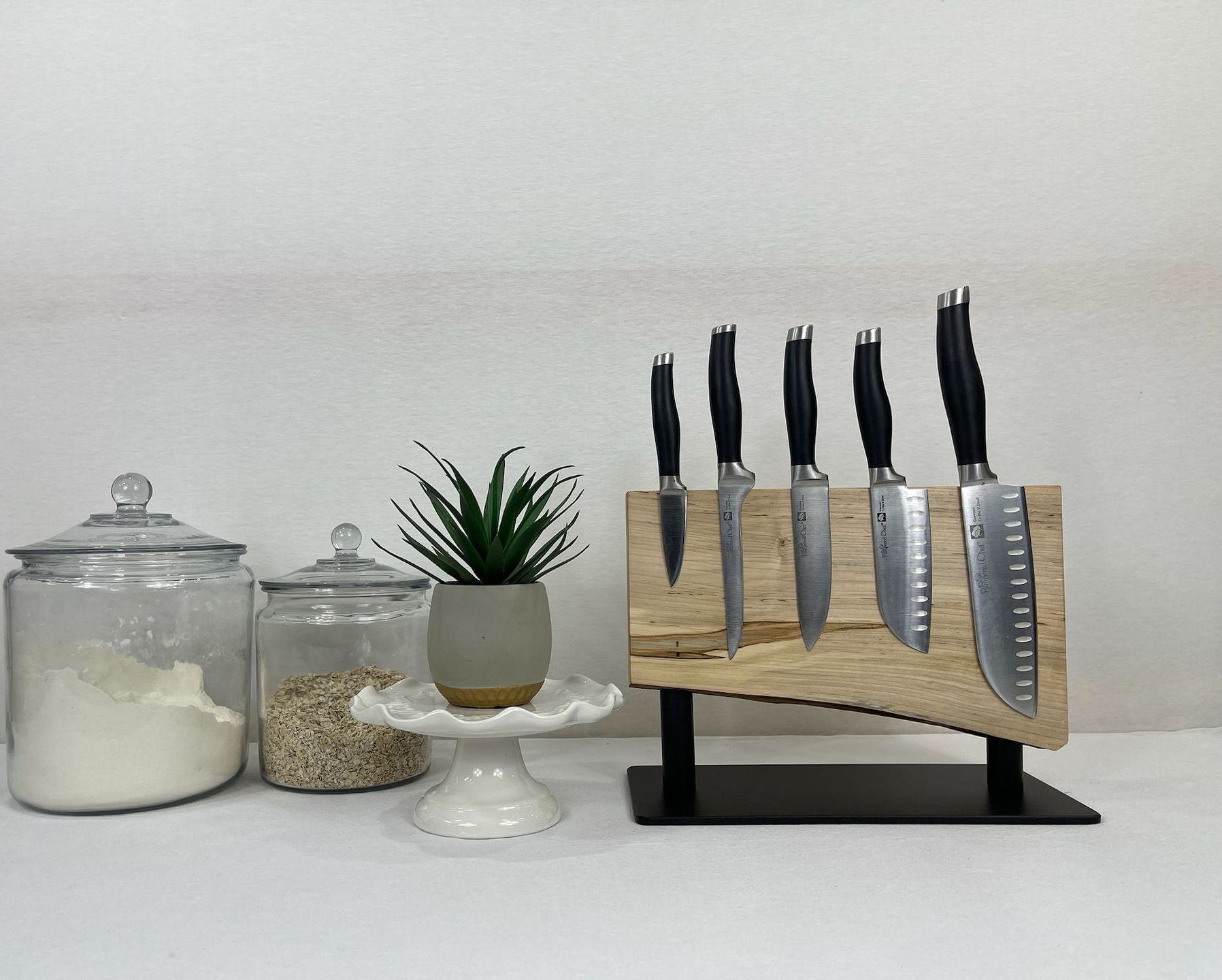 Introducing our collection of Magnetic Knife Blocks, each uniquely designed to enhance your culinary experience and add a touch of personalization to your kitchen. With three distinct styles to choose from - Classic Modern Magnetic Knife Blocks, Original Live Edge Magnetic Knife Blocks, and Pedestal Magnetic Knife Blocks - and the option of Maple or Walnut wood, you can truly make these kitchen essentials your own.